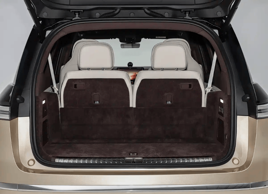 车身设计以极简主义为核心,纯平侧窗与隐藏式门把手营造出流畅的视觉效果,23英寸锻造轮毂搭配电动脚踏板,既彰显运动气质又兼顾实用性。翼子板区域创新集成激光雷达与"九曜侧翼光阶"灯带,该灯带可实现迎宾交互与智能驾驶状态提示功能。车尾采用贯穿式超红LED灯带设计,后备箱空间表现突出,常规容积达600升,通过隐藏式储物区与第三排座椅放倒功能,最大可扩展至1586升。