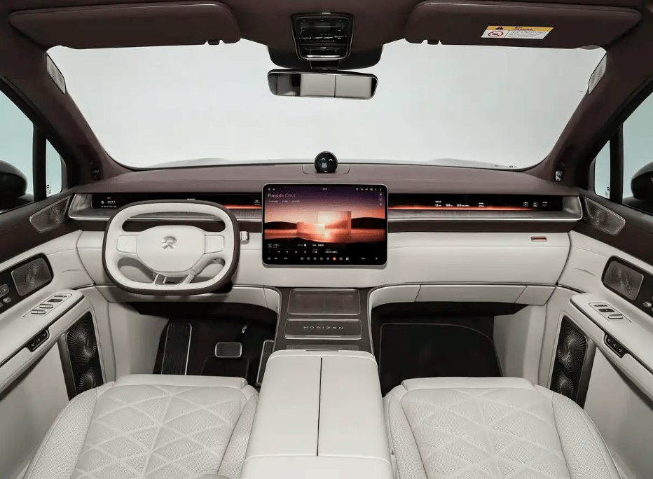 座舱内部延续蔚来家族式设计语言,15.6英寸中控屏与48英寸天际线屏幕构成沉浸式交互界面,椭圆形方向盘搭配Nappa真皮与枫影真木饰板,营造出豪华与科技交融的驾乘环境。六座布局采用2+2+2形式,第二排配备"飞航零重力座椅",集成加热、通风、按摩功能,并设有电动遮阳帘、阅读灯及双娱乐屏。中岛版本特别设置中央操控屏与隐藏式小桌板,第三排座椅支持电动调节与加热功能,配备手动遮阳帘提升舒适性。